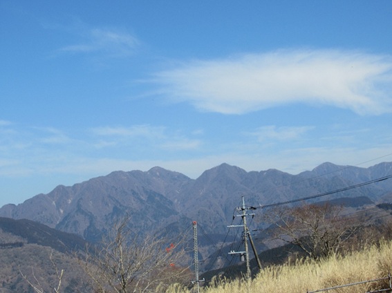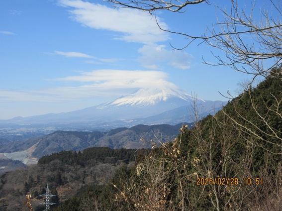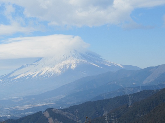 ここからは歩き易い山道でどんどん登る。車道に出たところに頼朝桜があり、左に少し進み、右の道に入る。時折富士山が顔御出し、楽しませる。鉄塔を過ぎれば十字路で、休憩所がありジャムなどを無人販売している。ここから本格的な急登となる。柵を開けて入ると九十九折れの道となり、カヤトの中を進む。振り返れば富士山が良く見えるが、残念なことに頭に雲が掛かっている。634mの標識を過ぎれば登りはあと僅かで、最後は緩やかな道を進めば頂上に出る。