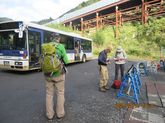 高尾駅北口小仏行きバス停に集合し、バスで小仏まで向かう。バスはほぼ満杯で小仏川沿いを進む。
