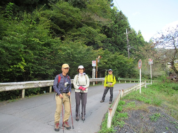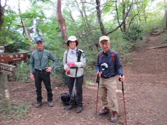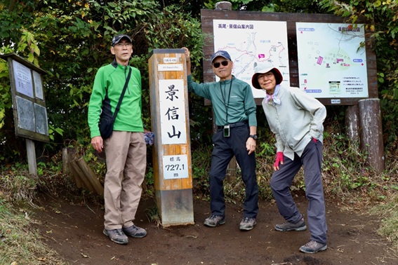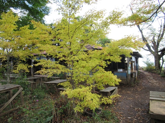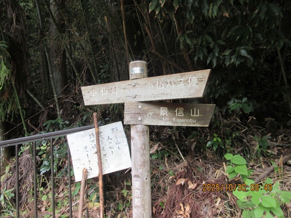 バス停で山支度を整え出発する。小仏峠に向かう舗装道路を行き、ヘアピンカーブを回った所で山道に入る。少しえぐれた急な山道を登って行く。周りの広葉樹は少し紅葉が始まっていて、目を楽しませる。小下沢からの道に合流すると景信山までは後僅かで、最後の階段を登ると景信山頂上に飛び出す。