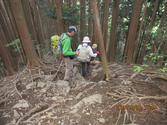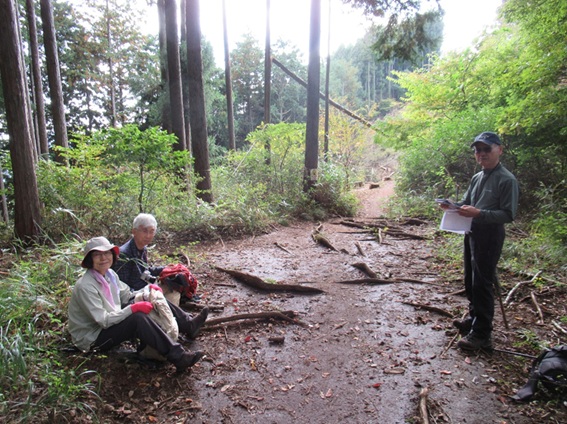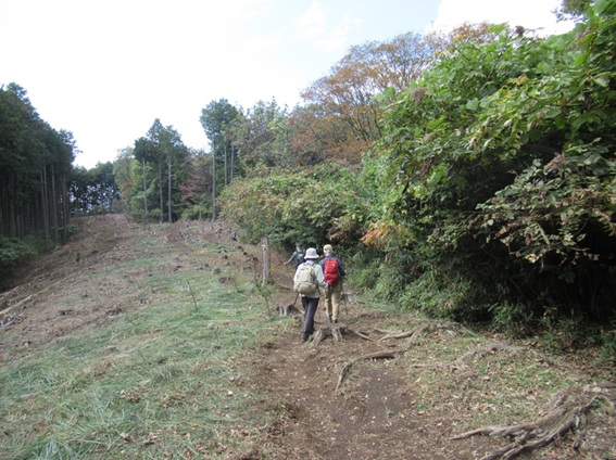 堂所山は展望も無いということで、パスして巻道を進む。巻道が終わると明るく開けた伐採地があり、その手前で一服する。