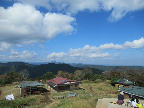 頂上は草原となっており、ベンチが散在する。丹沢から扇山、生藤山や大岳山などの奥多摩の山が見えているが、富士山は残念ながら雲の中だ。茶店も有り、ここは開いている。